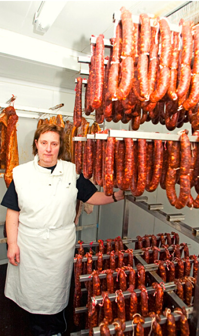 Mari Ángeles y Jesús Mari elaboran artesanalmente exquisitos embutidos con carne de ganado porcino en su pequeño obrador, habilitado en un rincón de su vivienda en Arbulu.